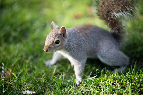 © Qi, Fototapeta premium Curious Squirrel in the Sunlit Grass