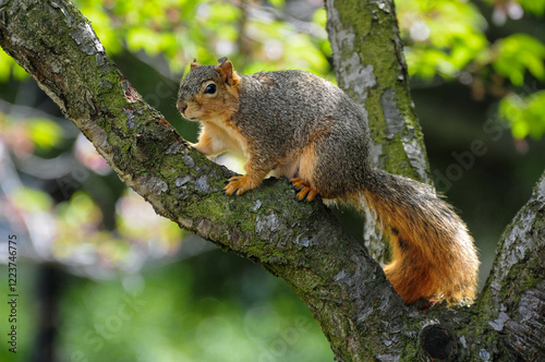 © Marquicio, Fototapeta premium Curious squirrel on branch in lush greenery, serene natural setting