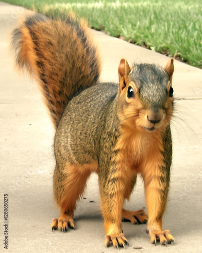 Fototapeta premium Curious squirrel on sidewalk, grass background