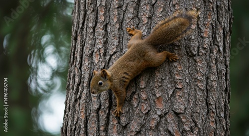 © Mister, Fototapeta premium Curious Squirrel on Tree Bark: A playful squirrel clings to rough tree bark in a natural forest environment. Its gaze is fixed forward, curious and alert, adding charm to this nature scene.