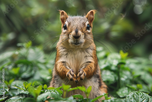 © smth.design, Fototapeta premium Curious Squirrel Peering Through Lush Green Foliage