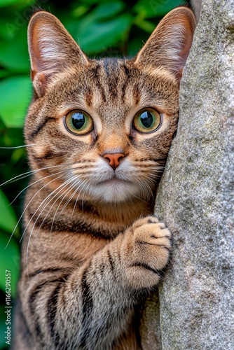 © Raveen, Obraz premium Curious striped cat posing beside a textured stone, looking directly at the camera with large expressive eyes