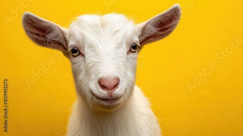 © Igor, Fototapeta premium Curious White Goat Head Shot with Vibrant Yellow Background
