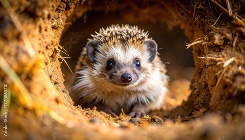 © Hyndk, Naklejka premium Curious wild hedgehog peeking shyly from its earthy burrow, a delightful close-up showcasing its spiky coat and innocent gaze in a natural environment, highlighting wildlife