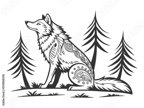 Obraz premium Curious wolf sitting in the forest, Scandinavian style, isolated hand-drawn...