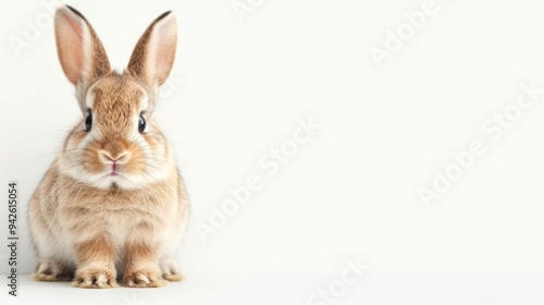 Fototapeta premium Curious young rabbit with soft fur and attentive expression, set against a minimalistic white background, radiating warmth and innocence