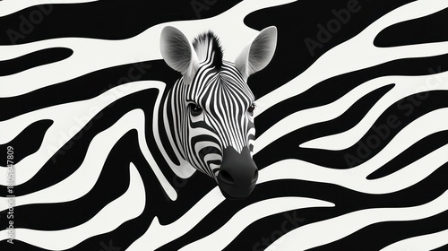 Fototapeta premium curious zebra head emerging from seamless black and white striped background, minimalist high-contrast portrait conveying calm curiosity and surreal graphic energy