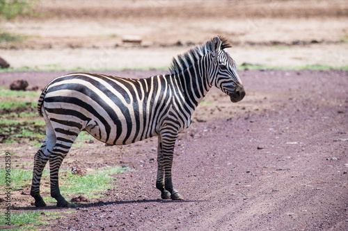 © ilyaska, Naklejka premium Curious zebra staying on gravel road