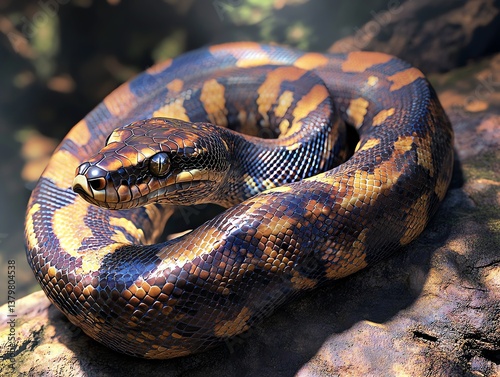 © mh, Obraz premium Curled Snake Close-up with Intricate Scale Pattern on Rock Surface