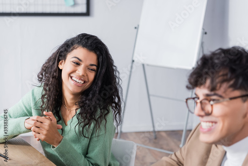 Fototapeta premium Curly hispanic woman laughing, while looking at co-worker sitting at desk in office on blurred foreground