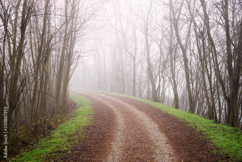 © alpegor, Fototapeta premium Curve along an tree lined dirt road covered in thick freezing fog on a winter morning