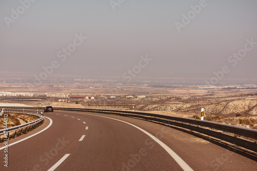 © vita, Fototapeta premium Curve road in a desert dry landscape. A bend of an asphalt road with excellent pavement, a dividing strip and a guardrail. Infrastructure, mobility, movement concept. Travel around the world, car trip