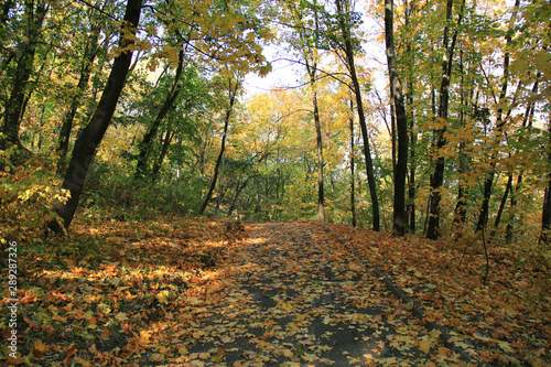 © Roden_W, Obraz premium Curved and old park path, covered with yellow leaves. Golden autumn in a city park