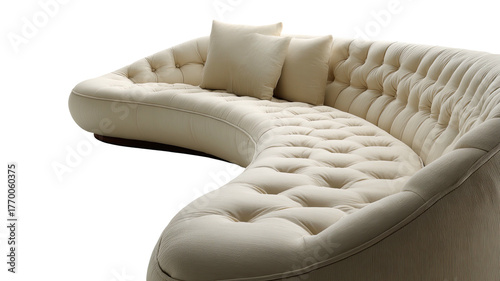 © Taufiq, Obraz premium Curved, cream couch, deep button tufting, two square pillows