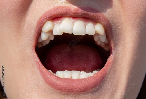 Obraz premium Curved female teeth, before installing braces. Close - up of teeth before treatment by an orthodontist