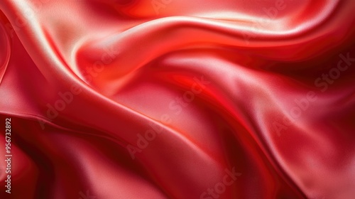 © 69, Fototapeta premium Curved, flowing red fabric with a light crimson hue, reflecting light in a glossy, abstract pattern. The soft focus provides a stylish, elegant background.