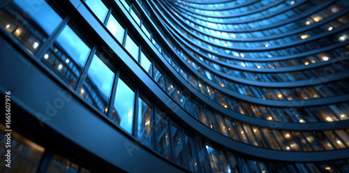 Obraz premium Curved glass building illuminated by evening lights, showcasing stunning...