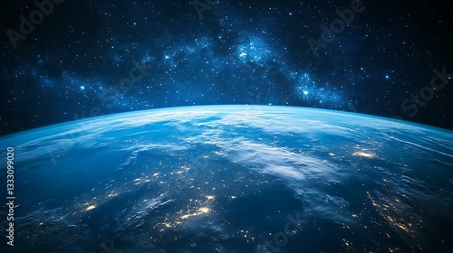 Obraz premium Curved horizon of Earth from space with breathtaking view of atmosphere and galaxy. Cosmic perspective of our planet. Big Bang Day