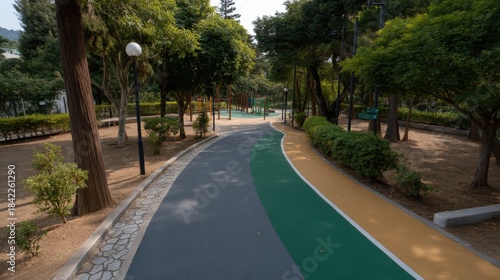 © Cozirlax, Obraz premium Curved Path in Friendly Park for Children Surrounded by Lush Green Trees