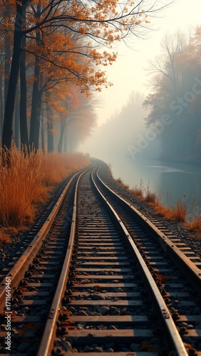 © Tina, Fototapeta premium Curved Railway by River at Autumn Dawn