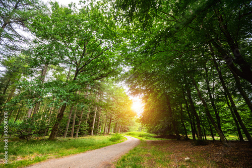 Fototapeta premium Curved road in a green forest in the springtime