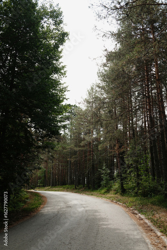 © Ekaterina, Fototapeta premium Curving asphalt road through pine forest in Tara National Park, Serbia. Quiet summer travel scene under soft light and green trees.
