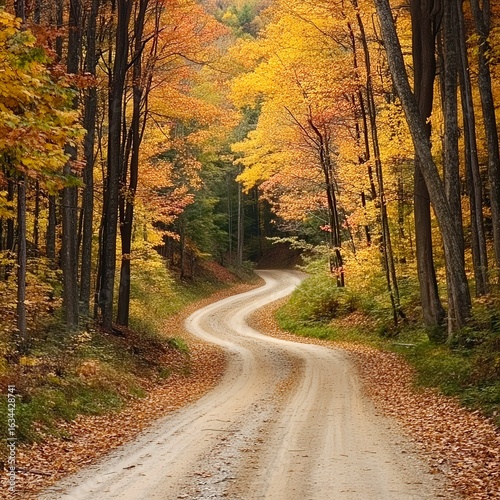 © gen_pick, Fototapeta premium Curving autumn road with soft light and golden tree forest
