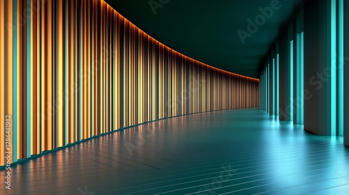 Fototapeta premium Curving corridor glows with warm amber and cool teal light creating a...