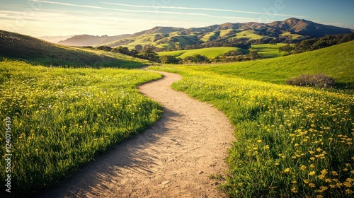 Obraz premium Curving Dirt Path Wanders Through Green Meadow with Wildflowers