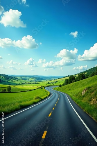 © YASUMIN, Fototapeta premium Curving highway road stretching through countryside with green fields and blue sky, road, journey