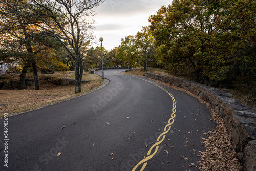 Fototapeta premium Curvy asphalt road with a yellow painted road marking.