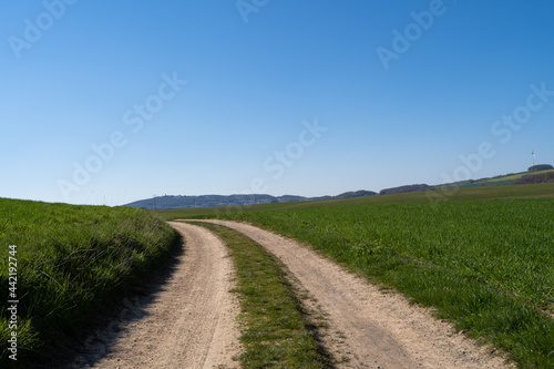 Fototapeta premium Curvy country road on hill with nice blue sky