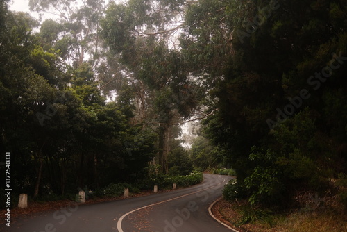 © Olga, Fototapeta premium Curvy Mountain Road Winding Through Dense Forest on a Misty Morning
