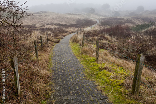 Naklejka premium Curvy path through foggy dunes on German island Spiekeroog