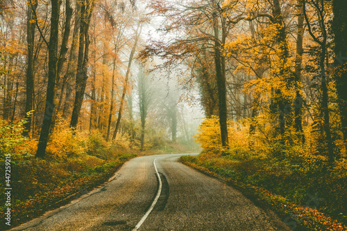 © Melinda Nagy, Obraz premium curvy road in beautiful foggy forest in autumn