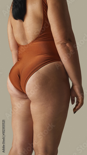 Fototapeta premium Curvy woman in rust swimsuit viewed from behind with natural folds and...