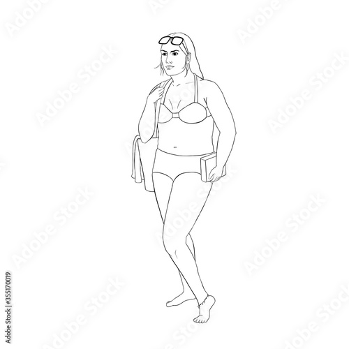 © Roser, Fototapeta premium Curvy woman wearing bikini, walking at the beach with an book in her hand.