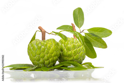 Fototapeta premium Custard apple isolated on white background with stem and leaves