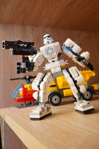 © Everyday Frame, Naklejka premium Custom-built LEGO Star Wars Stormtrooper mech robot figure holding a blaster weapon, displayed on a wooden shelf with other toys in the background