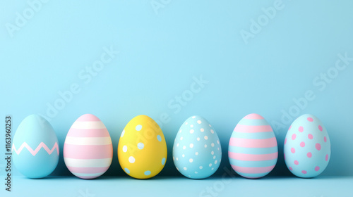 © Teeradej, Obraz premium Custom decorated easter egg concept. Colorful pastel Easter eggs with patterns on blue background