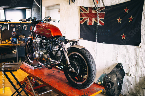 © Dusko, Fototapeta premium Custom motorcycle shop interior with New Zealand flag on the wall