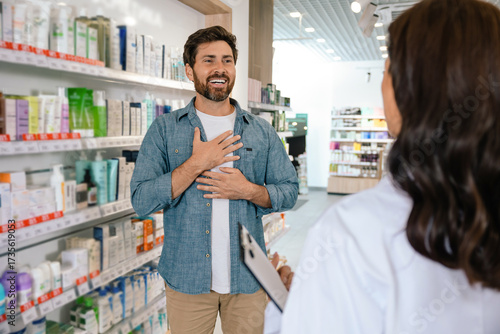 © zinkevych, Obraz premium Customer standing with pharmacist inside drugstore