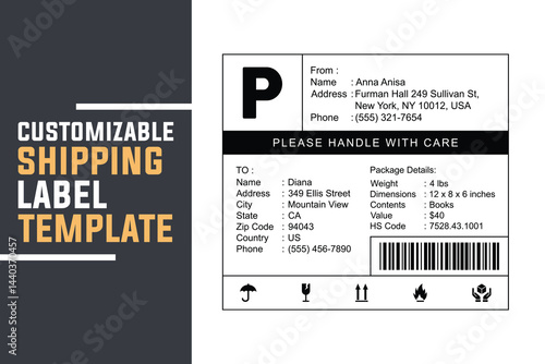 Naklejka premium Customizable Shipping Label Template. Editable Delivery Label for Packages, E-commerce, and Logistics
