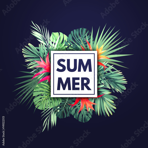 © Ms.Moloko, Fototapeta premium Customizable vector floral design template for summer beach party. Tropical flyer with green exotic plants and red flowers.