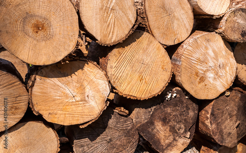 Naklejka premium Cut and stacked timber logs being aged in the sun for processing in Warren...