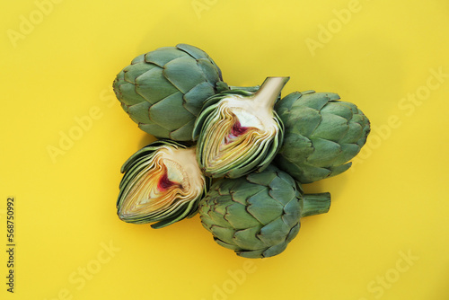 © New Africa, Obraz premium Cut and whole fresh raw artichokes on yellow background, flat lay