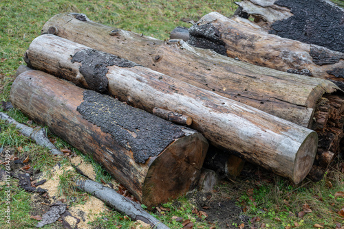© lapis2380, Fototapeta premium Cut parts of the trunk outside on the hillside.