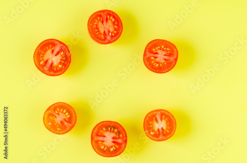 © AndyPhoton, Fototapeta premium Cut tomatoes on yellow background