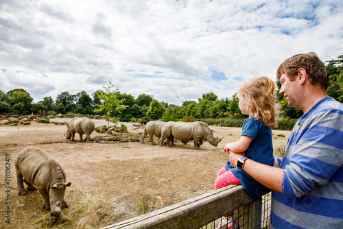 © Irina Schmidt, Fototapeta premium Cute adorable toddler girl and father watching wild rhinos in zoo. Happy baby child, daughter and dad, family having fun together with animals safari park on warm summer day. Ireland