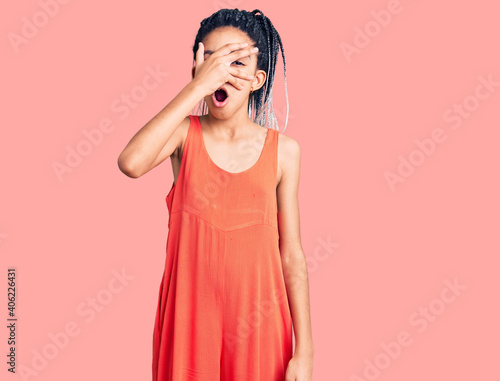 Fototapeta premium Cute african american girl wearing casual clothes peeking in shock covering...